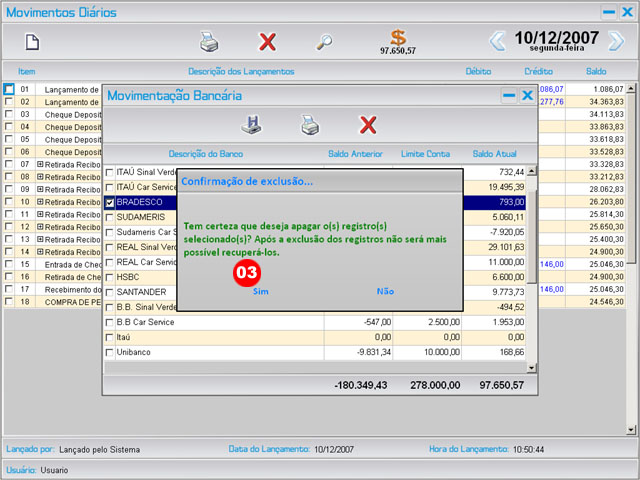 | Administrativo >> Lan�amentos Di�rios >> Novimento Banc�rio >> Excluir |