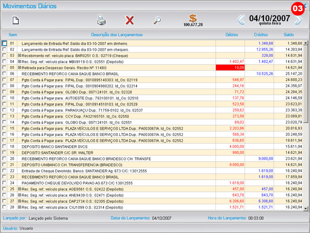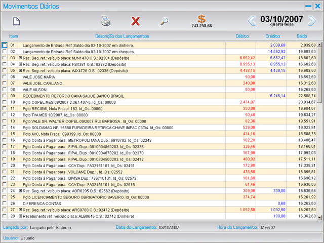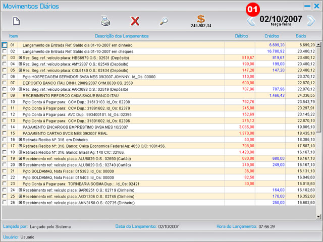 Ao acessar a Tela de Lançamentos Diários, serão listados todos os registros do dia selecionado |