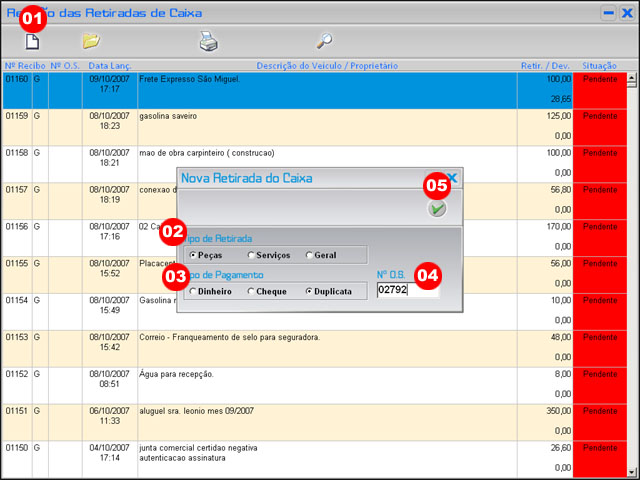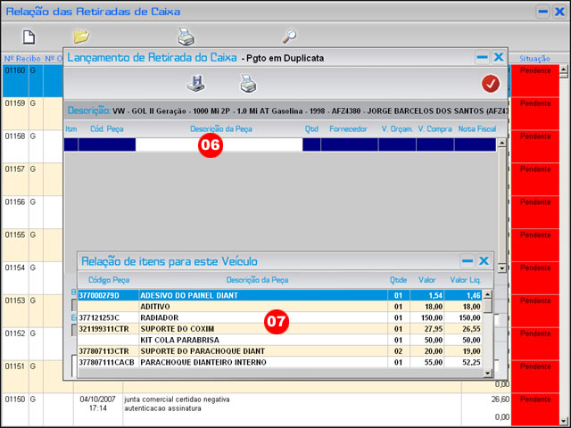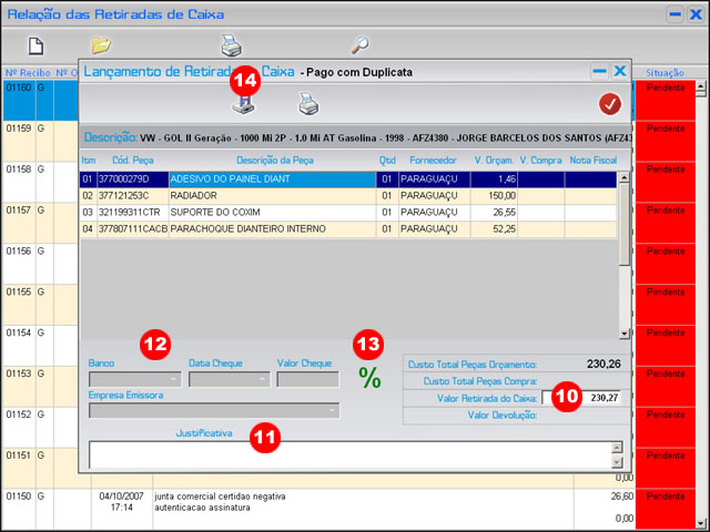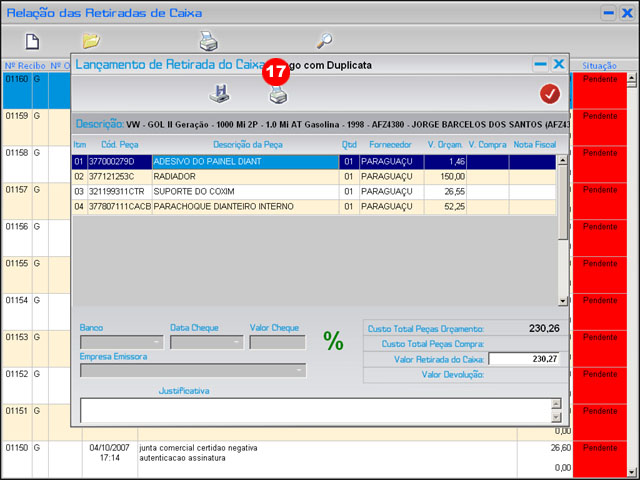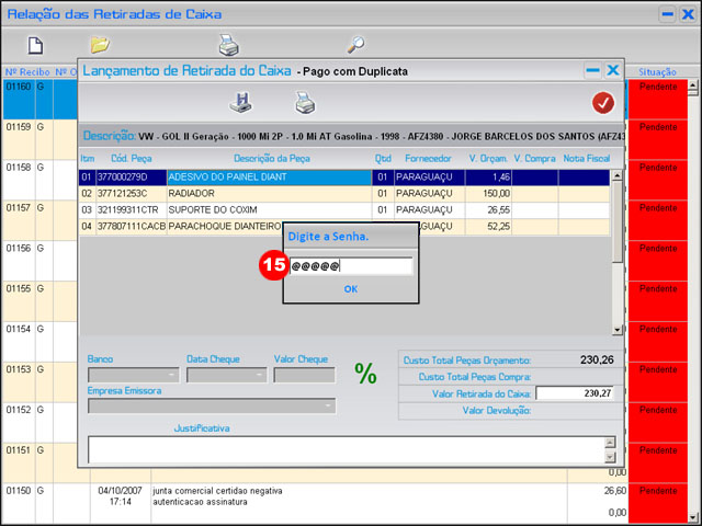 | Administrativo >> Retiradas do Caixa >> Nova Retirada >> Peças |