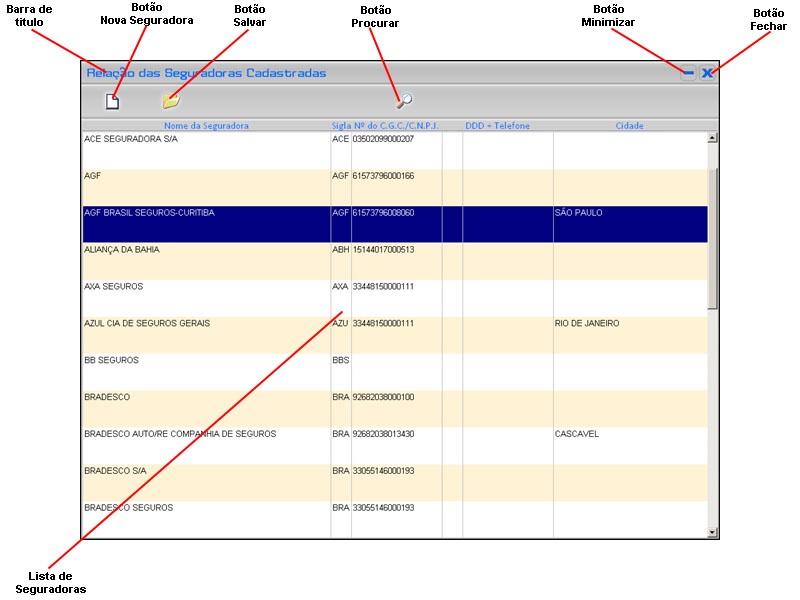 Ap�s ser� aberta a tela de Relação de Seguradoras |