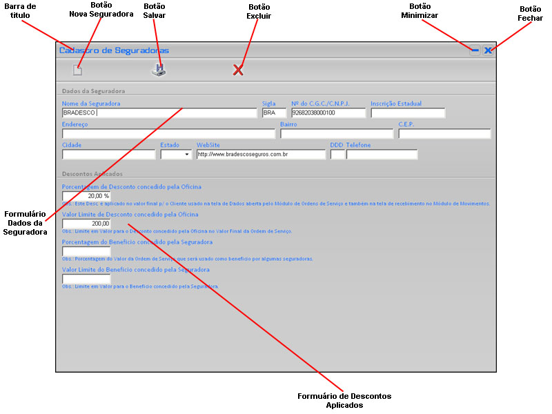 Clicando no botão [ Nova Seguradora ] ou no botão [ Abrir ] será aberta a tela de Cadastro de Seguradora |