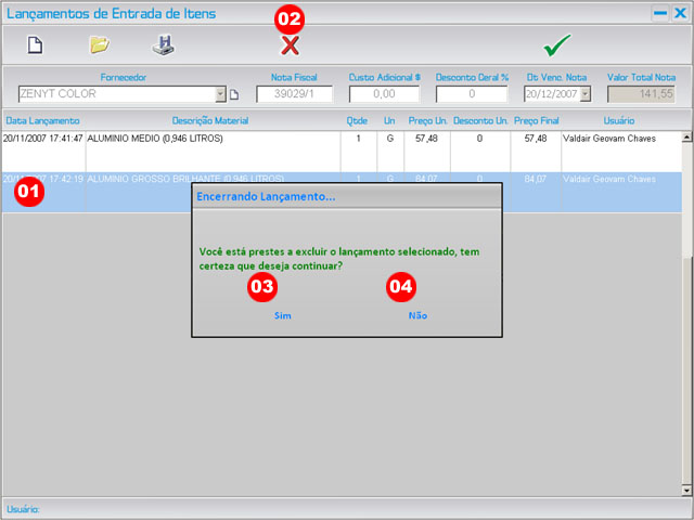 ( 01 ) Para excluir um item no Lan�amento de Entrada de Material, selecione o item na lista de itens |