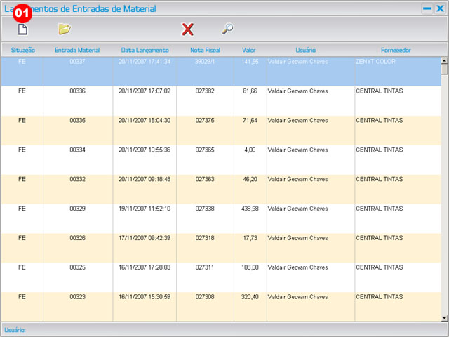 ( 01 ) Para lançar a entrada de materiais, Clique no botão Novo Lançamento |
