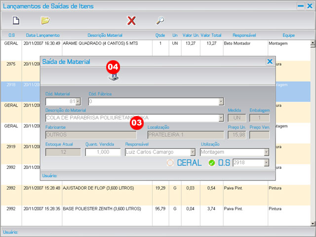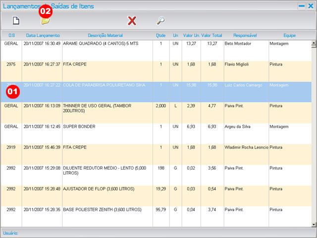 ( 01 ) Para alterar o Lançamento de uma Saída de Material, selecione o registro na lista de lançamentos ( o Lançamento selecionado ficará destacado na cor azul ) |