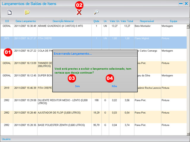 ( 01 ) Para excluir um Lançamento de Saída de Material, selecione o item na lista de itens |
